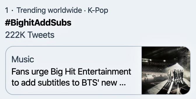 Big Hit’in kurucusu ve EŞ-CEO’su Bang Shi Hyuk’un, çeviri yapan hayranların BTS’i “YouTube Neslinin Beatles’ı” haline getirmesindeki yardımından bahsetmesi ve BTS’in Global Resmi Fan Klübü için üyelik kiti olan ARMY ZIP içeriğinin alt yazısız olarak yayımlanması, uzun zamandır konuyla ilgili sıkıntılarını dile getiren ARMY’lerin #BigHitAddSubs etiketiyle konuyu sosyal medyaya taşımasına neden oldu.