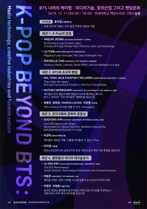 Kore Gazetecilik ve İletişim Araştırmaları Kurumu’nun (KSJCS) ev sahipliği yapacağı, “BTS’in Ardındaki K-Pop: Medya Teknolojisi, Yaratıcı Sektörler ve Fandom Kültürü” başlıklı seminer, 11 Aralık’ta, Seul’deki Shinchon Yonsei Üniversitesi’nde düzenlenecek.