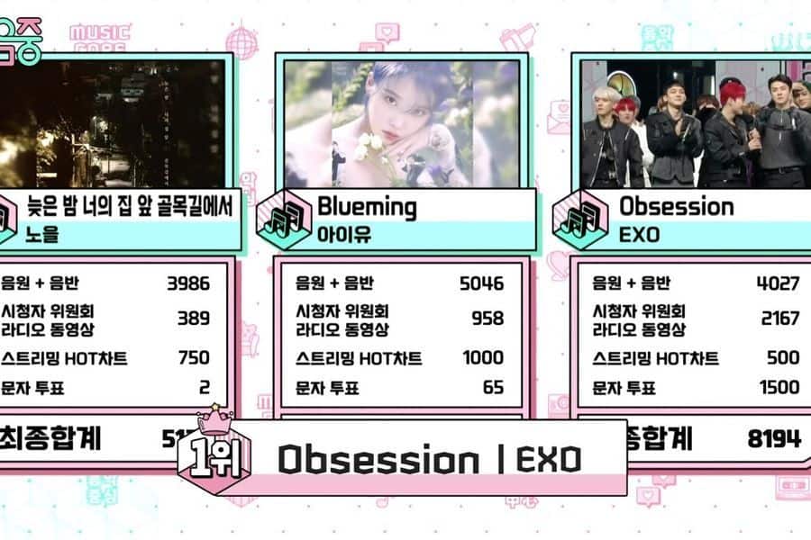 MBC’nin ‘Music Core’ müzik şovunun 7 Aralık bölümünde birincilik için Noel “Late Night” , IU ‘Blueming’ ve EXO ‘Obsession’ ile aday oldu. Noel 5127 puanla üçüncü, IU 7069 puanla ikinci oldu.