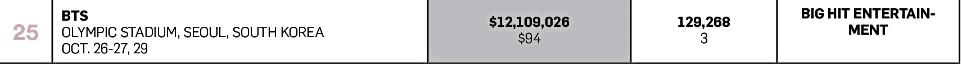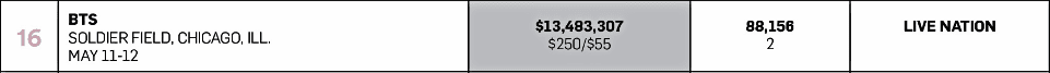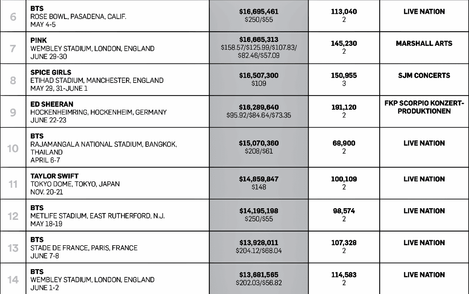 BTS ayrıca, genel listede de, Ed Sheeran ve P!NK’in ardından 3. sırada yer aldı. Grup; İngilizce şarkı söylemeyen bir sanatçının “En İyi 40 Tur” listesinde elde ettiği en yüksek sıralamayı kaydederek, Billboard Boxscore’da tarih yazmış oldu.