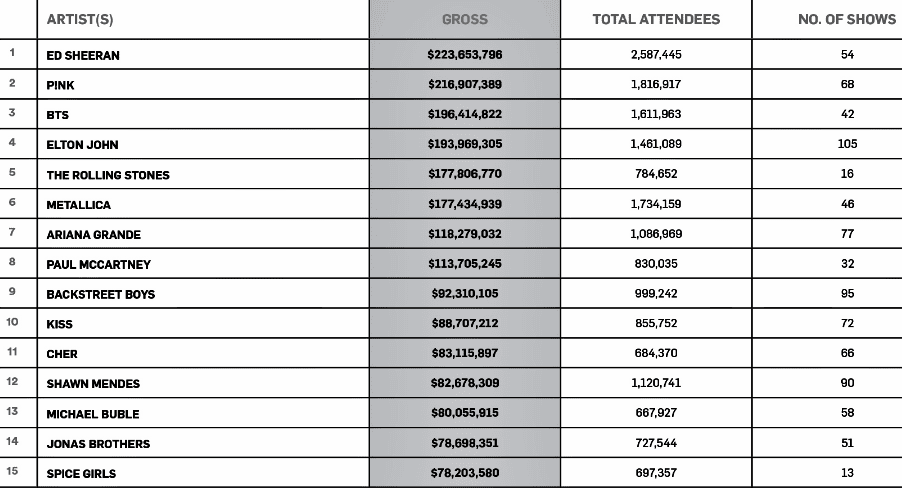 Billboard's 2019 Year End Boxscore Top Touring Artists: