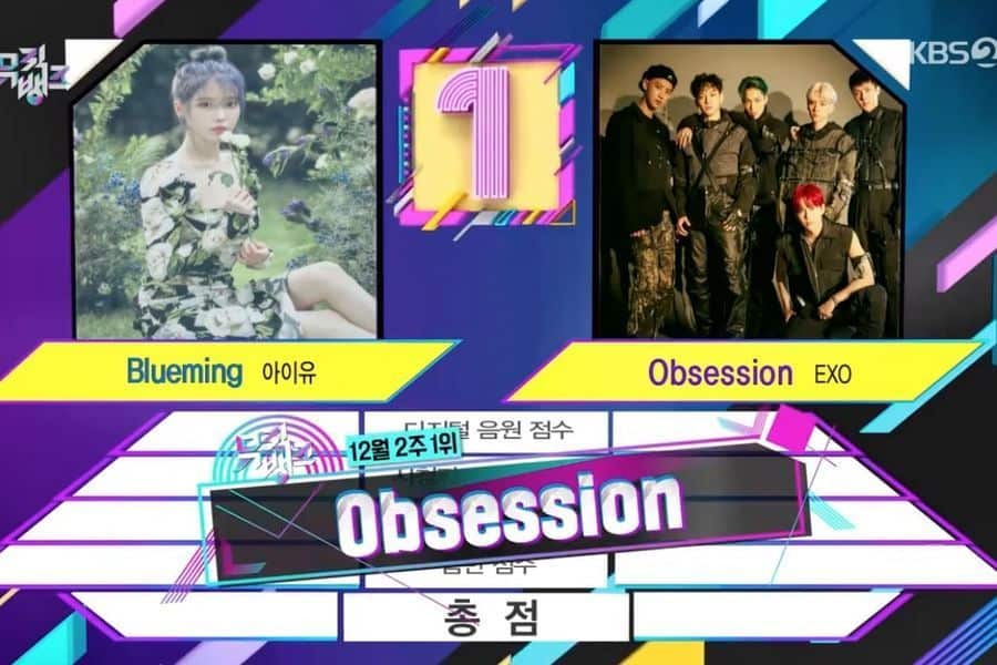 KBS’in ‘Music Bank’ müzik programının 13 Aralık bölümünde birincilik için EXO ve IU aday oldu. IU 5021 puan alırken, EXO 5716 puan alarak ‘Obsession’ ile 4. galibiyetini kazandı.