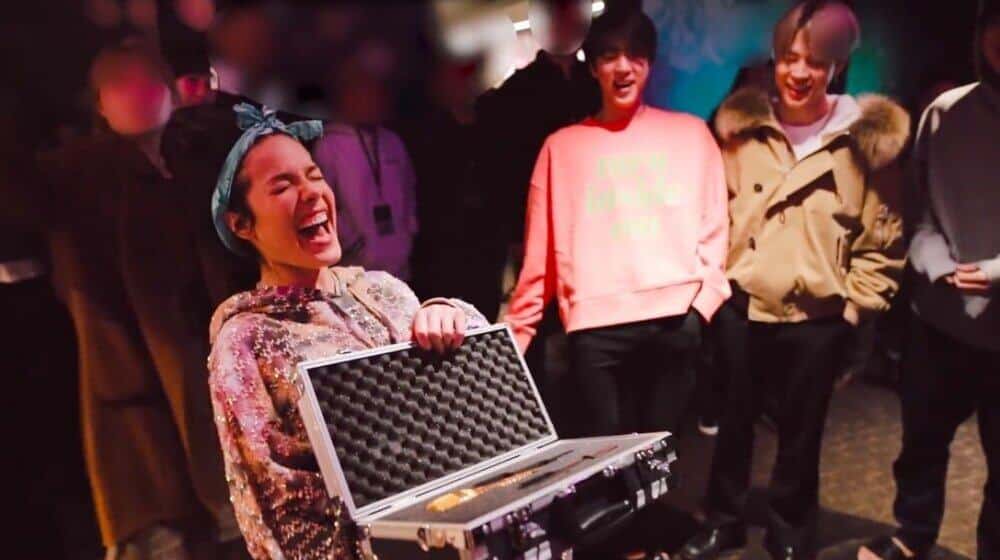 BTS üyeleri mikrofonu, üzerinde ışıltılı bir şekilde Halsey’nin adının yazdığı, özel bir çantayla verdiler.