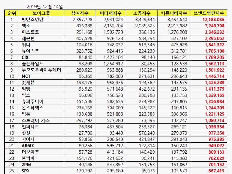 Sıralamalar, 12 Kasım-13 Aralık tarihleri arasında toplanan büyük veriler kullanılarak; çeşitli erkek gruplarının tüketici katılımı, medya kapsamı, etkileşim ve kamu farkındalığı endekslerinin analizi ile belirlendi.