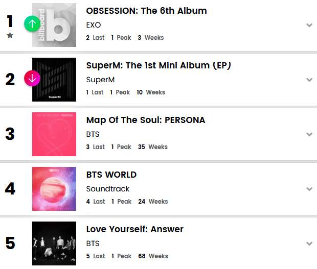Billboard‘un bu hafta yayımlanan “Dünya Albümleri Listesi”nde EXO, yeni albümü “OBSESSION” ile 3. haftasında 1 numaraya yükseldi.