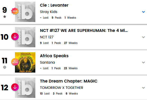 NCT 127, “We Are Superhuman” ile 27. haftasında 10 numarada ve TXT, “The Dream Chapter: MAGIC” albümüyle 6. haftasında 12 numarada bulunuyor.