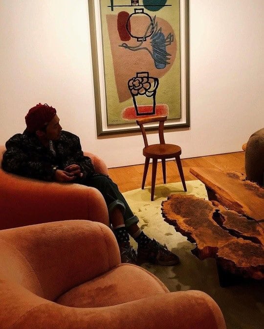 G-Dragon, bir sanat galerisinde dolaşırken, parlak desenli ayakkabılar, büyük beden bir ceket ve paçaları katlanmış kot pantolon ile oluşturduğu eşsiz stilini sergiliyor.