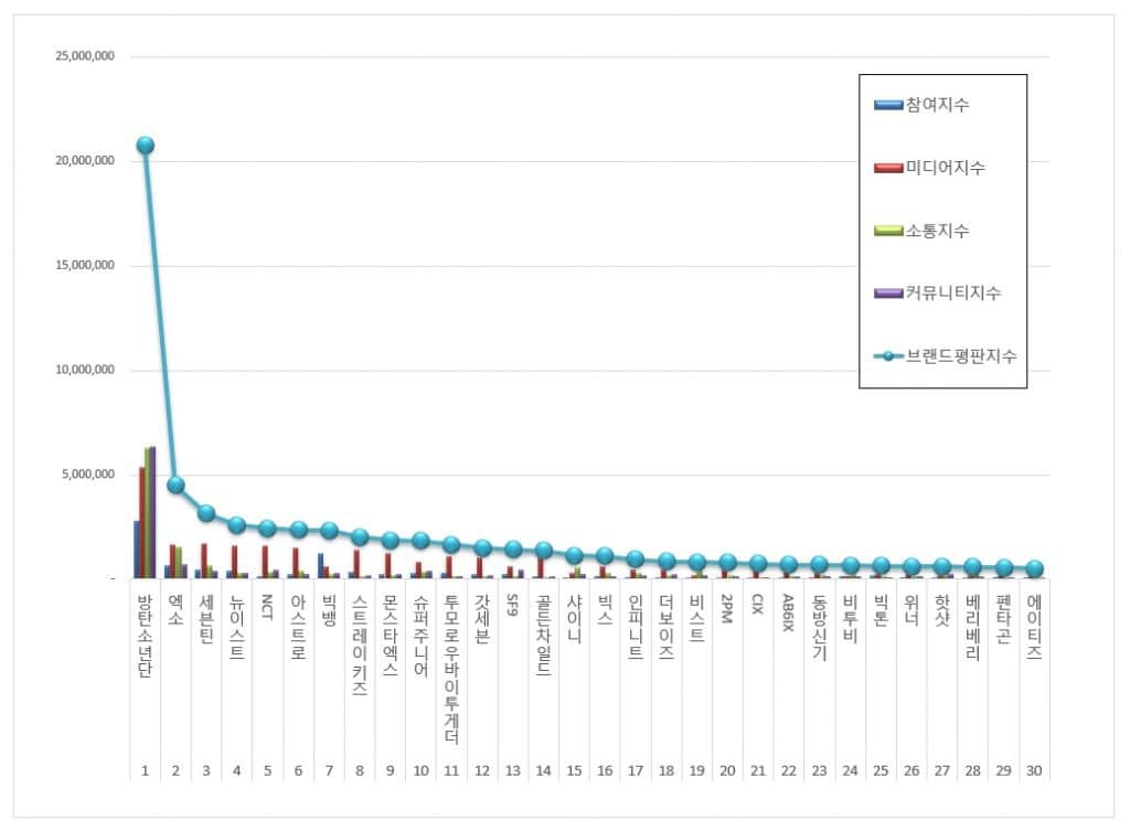 EXO, bu ay 4.484.865 toplam marka itibar endeksi ile 2. sırada yer aldı. SEVENTEEN, Aralık ayından bu yana puanlarında %37,02 artış gördükten sonra 3. sırada yer alarak 3.144.646 aylık marka itibar endeksi elde etti.