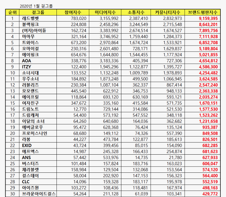 Ocak 2020 için marka değeri açısından 1 numaralı kız grubunu ünvanı toplam 9.159.395 puanla Red Velvet’a gitti. 2. sırada toplam 8.643.201 puanla BLACKPINK yer alırken, 3. sırada çaylak kız grubu (G)I-DLE 7.895.756 puanla yer aldı.