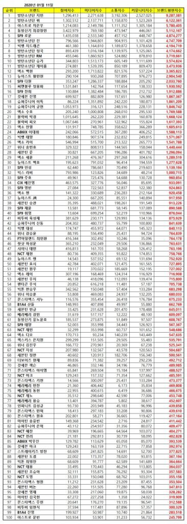 Sıralamalar, 10 Aralık 2019 – 11 Ocak 2020 arasında toplanan büyük veriler kullanılarak, 598 erkek grup üyesinin tüketici katılımı, medya kapsamı, iletişim ve toplum farkındalığı endekslerinin analizi ile belirlendi.