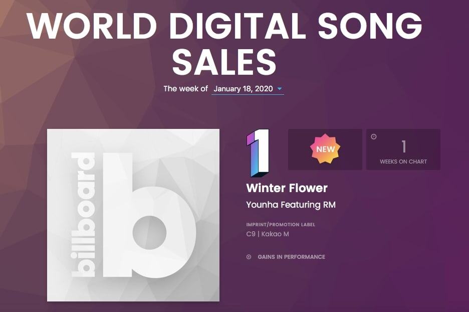 RM‘le işbirliği şarkısı “Winter Flower”, Billboard‘un Dünya Dijital Şarkı Satışları Listesi‘ne ilk sıradan giriş yaptı.