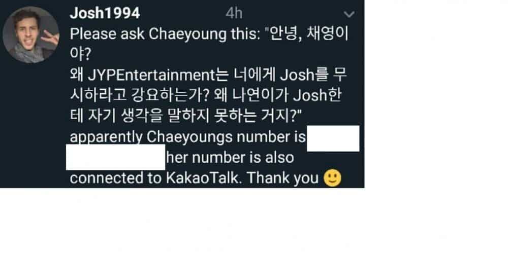 TWICE’dan Nayeon’un yabancı takipçisi, JYP Entertainment tarafından suçlanmasının ardından yine bir gerginlik oluşmasına sebep oldu. Josh adlı stalker, Chaeyoung’un cep telefonunu Twitter’da herkese açık bir şekilde yayınladı, ancak özel bilgilerin sızdırılmasına ilişkin politikaları ihlal ettiği için hemen kaldırıldı.
