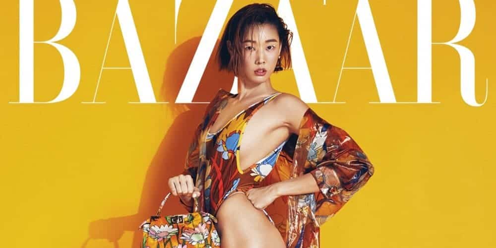 Kapak fotoğraf çekimi için Han Hye Jin, ‘FENDI’nin 2020 ilkbahar / yaz koleksiyonu’nu giydiği mayo, çiçekler ve tulumlarla gösteriyor.
