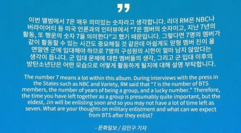 Soru: “…Bu nedenle, grup olarak bir arada kaldığınız süre muhtemelen oldukça önemlidir. Ancak grubun en büyüğü Jin yakında askere kaydolacak ve bu nedenle yedi kişi olarak fazla zamanınız kalmamış olabilir. Askerlik hizmeti hakkında ne düşünüyorsunuz ve BTS’ten askere kaydolduktan sonra ne beklenebilir?”
