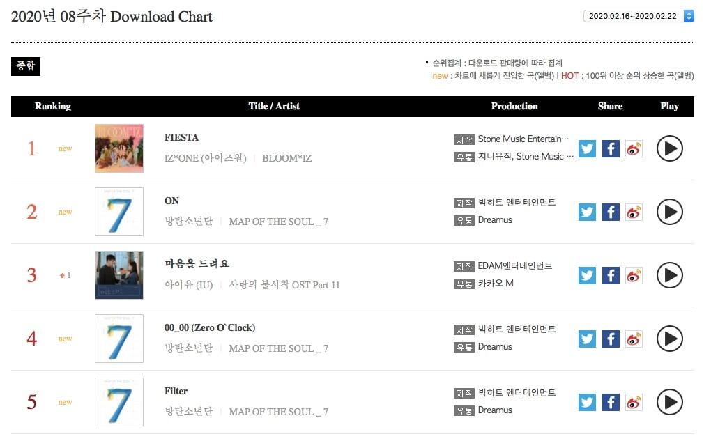 IZ*ONE’ın “FIESTA”sı, bu haftanın dijital indirme tablosunda 1 numaraya çıktı. BTS, ilk 5’te yeni albümünden 3 şarkı ile yer aldı; başlık parçaları “ON” 2. sırada yer alırken, “Zero O’Clock” 4 ve “Filter” ise 5 numaradan listeye girdi. IU’nun “I Give You My Heart” şarkısı ise hafta boyunca 3 numarada yer aldı.