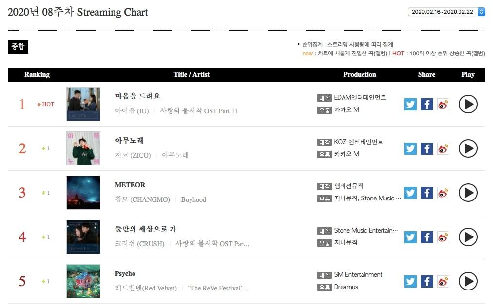 IU’nun “I Give You My Heart”ı 1 numaradan stream grafiğine girdi. Zico, “Any Song” ile 2 numarada yer aldı. Changmo, “METEOR” ile 3 numarada yer alırken, Crush “Let Let Go Go” 4 ile numarada ve Red Velvet “Psycho” ile 5. sırada yer aldı.