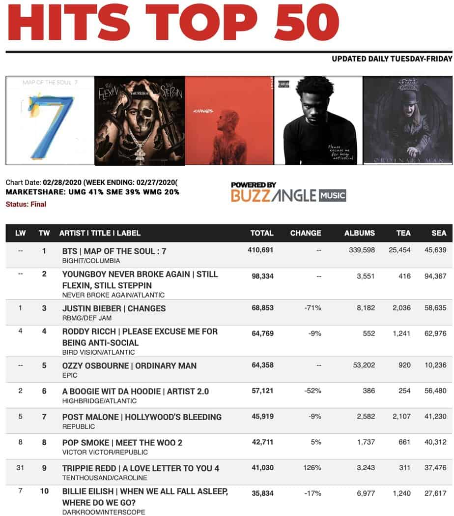 Updated look at the Hits Top 50 for this week: @BTS_twt earns massive #1 debut, @OzzyOsbourne & YoungBoy Never Broke Again debut top 5: https://t.co/GnEmQyNxnB pic.twitter.com/78gEWgSJmz