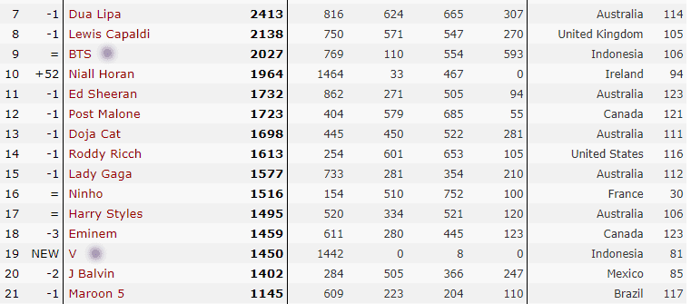 iTunes Şarkı Listesinde En Çok 1 Numara Olan Koreli Solo Sanatçılar: