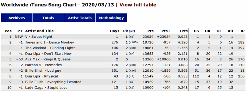 “Sweet Night” ile iTunes’un dünya çapındaki şarkılar listesinin de zirvesinde yer alan V, dijital sanatçılar listesinde de 19. sırada bulunuyor.