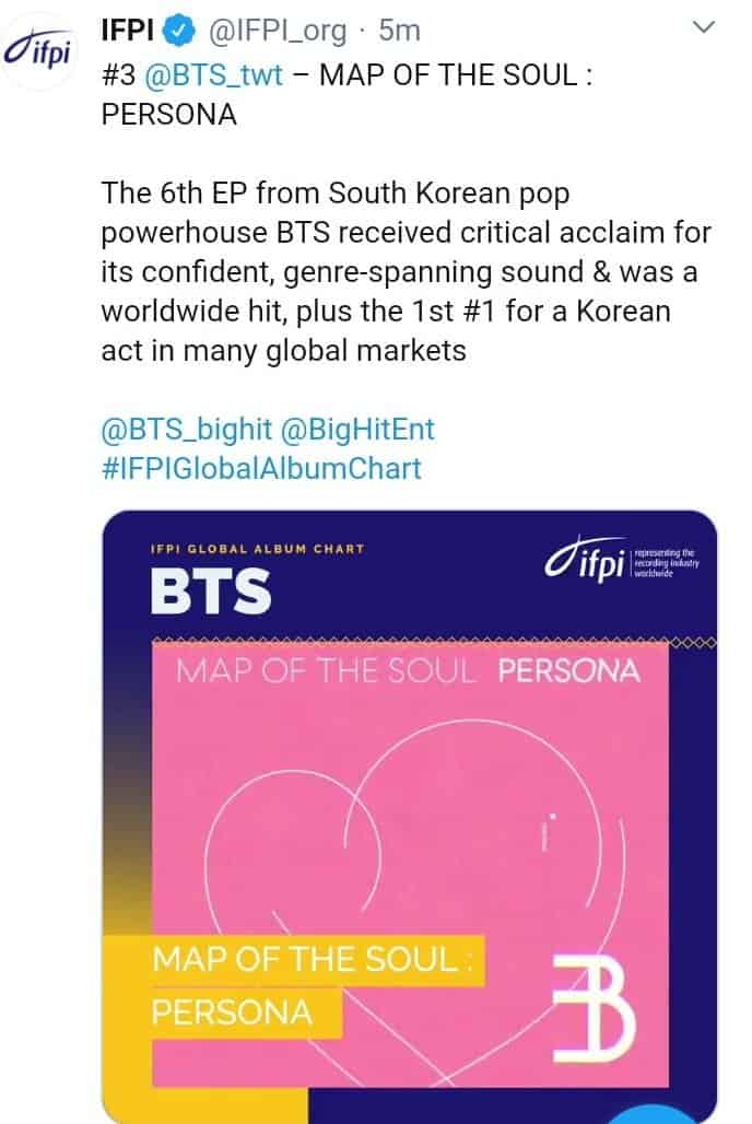 BTS ayrıca, 2 Mart’ta açıklanan IFPI’nin 2019’da dünya çapında en çok satan sanatçıları duyurduğu Global Artist Listesi’nde de 7. sırada yer aldı.