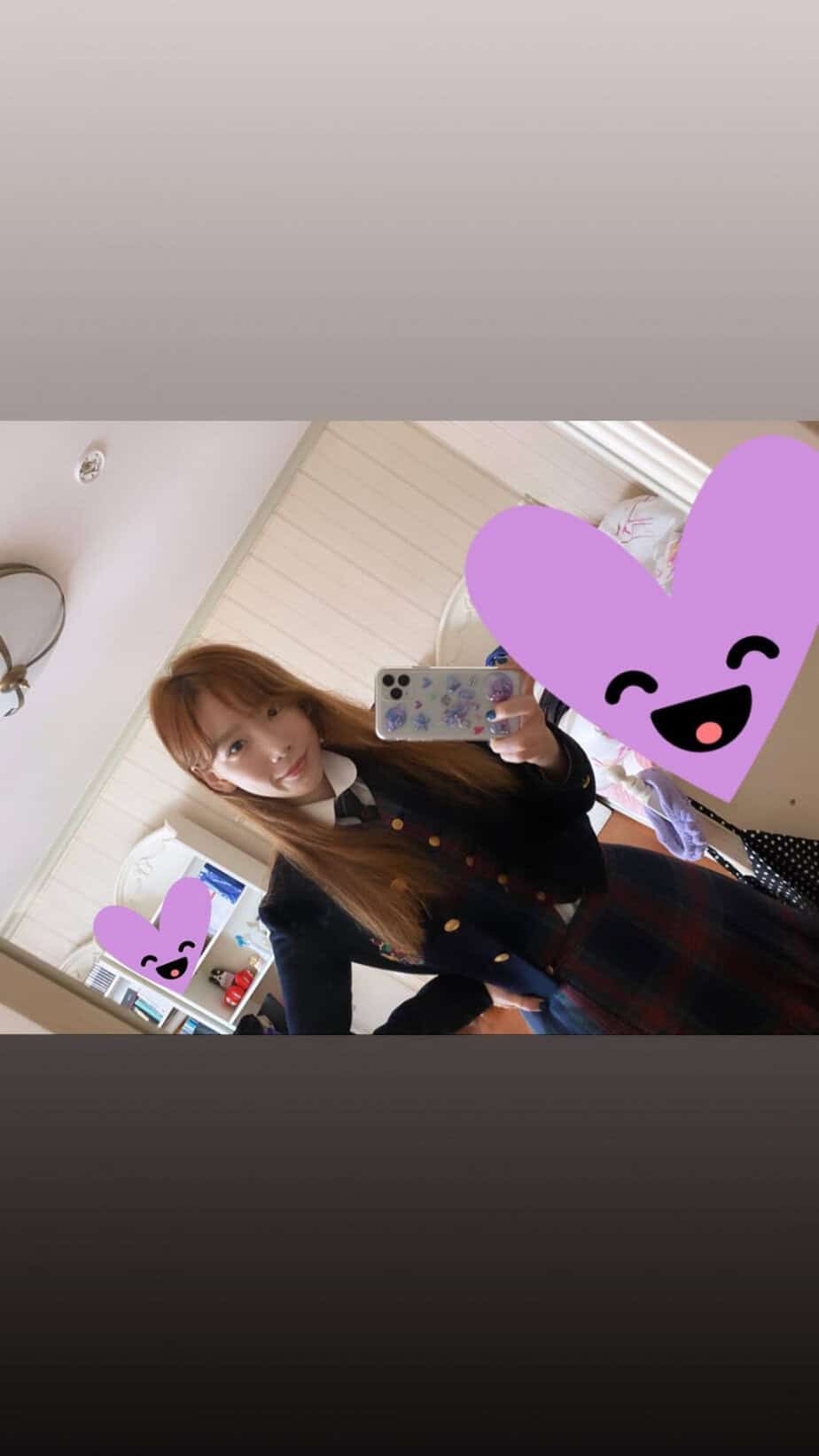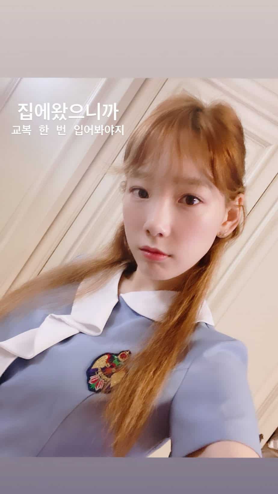“Eve geldiğime göre, okul üniformalarımı denemeliyim” diye bir mesajı, eski yatak odasında farklı okul üniformalarını giydiği bir dizi fotoğraf yüklemeden önce yazdı. Üniformalardan biri, altın düğmeli açık mavi ve basamaklı beyaz yakalı, diğeri ise ekose yelek ve ona uygun kravatlı ceketli bir takım şeklinde.
