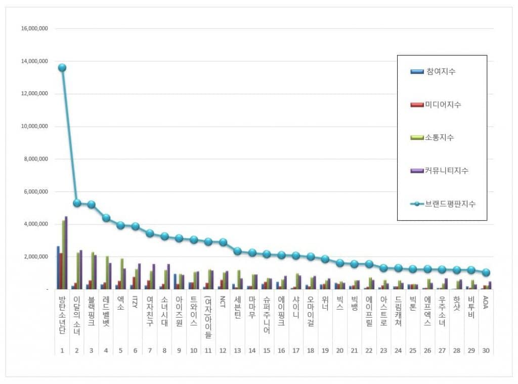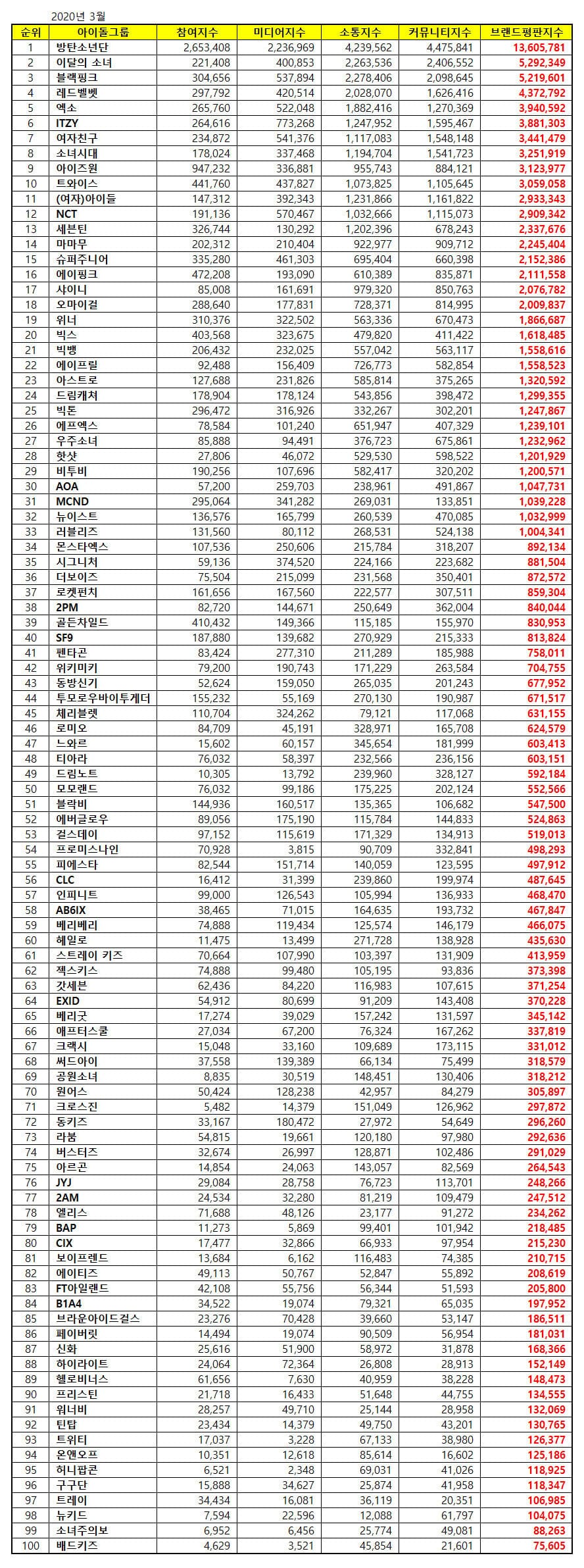 Sıralamalar, 26 Şubat – 27 Mart tarihleri arasında toplanan büyük veriler kullanılarak, 100 idol grubunun; tüketici katılımı, medya kapsamı, etkileşim ve toplum farkındalığı endekslerinin analizi ile belirlendi.