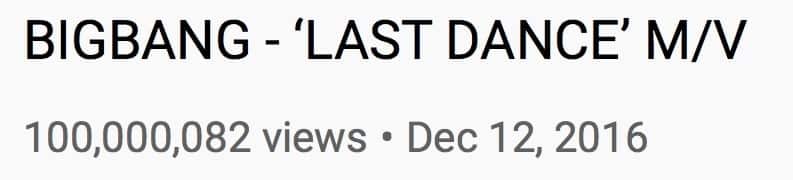“Last Dance”, BIGBANG’ın “Fantastic Baby,” “BANG BANG BANG,” “Loser,” “Bad Boy,” “Let’s Not Fall in Love,” “Blue,” “FXXK IT,” “BAE BAE,” “Sober,” ve “Haru Haru” 100 milyon izlenmeye ulaşan 11. müzik videosudur. Solo ve alt ünite müzik videoları da dahil olmak üzere, “Last Dance” grubun genel olarak 100 milyon izlenmeye ulaşan 17. müzik videosudur.