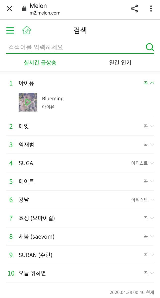 “에잇” şarkı isminin yayımlanmasının ardından, Melon gerçek zamanlı aramalarda 아이유 (IU) 1.sırada, 에잇 2. sırada, SUGA 4.sırada ve 에이트 (Eight) 5.sırada yer alıyor.