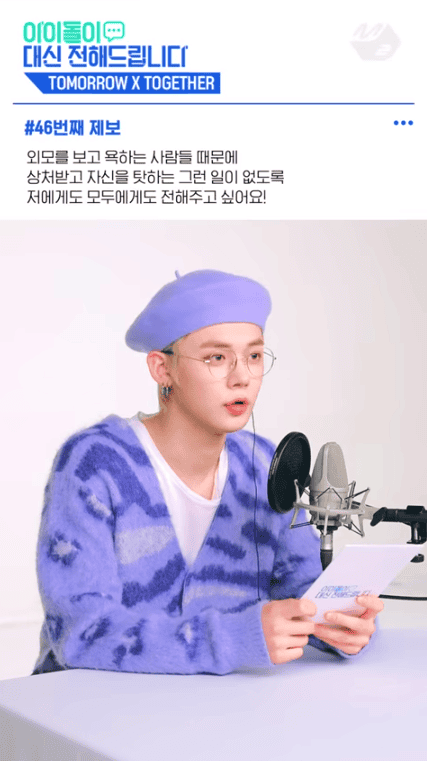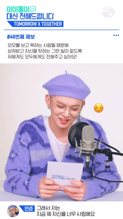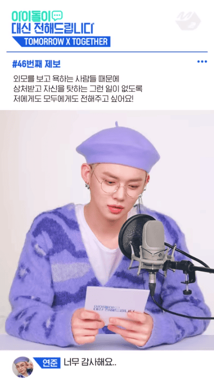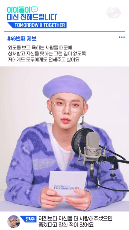 Hayranın anlattığı fiziksel görünümünden dolayı karşılaştığı zorbalıkla ilgili olarak; Yeonjun, herkesin değerli olduğunu ve onları özel yapan bir şeylere sahip olduklarını vurguladı. Görünüş, bir insanın yalnızca küçük bir parçasıydı.