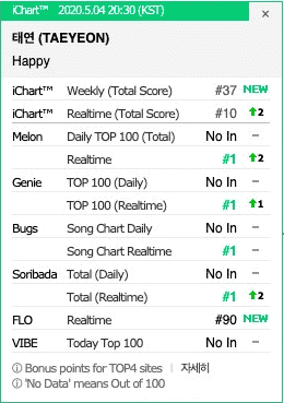 Taeyeon’un, “Happy” adlı yeni dijital teklisi 4 Mayıs 18:00’da yayınlandı. Şarkı 2 saat içinde, Melon, Genie, Bugs ve Soribada’nın gerçek zamanlı listelerinde hızla yükseldi.