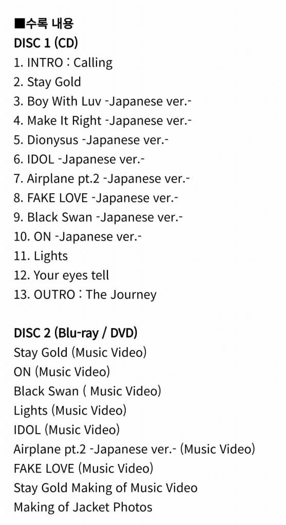 Albümde daha önce yayımlanmış ve hit olan 13 şarkının Japonca versiyonlarının yanı sıra, başlık şarkısı “Stay Gold” (Spiral Labyrinth dizisinin OST’si aynı zamanda) ve Jungkook‘un bestesine katıldığı ballad şarkı “Your eyes tell“de dahil olmak üzere 4 yeni parça yer alacak! Stay Gold için ayrıca bir müzik videosu olacak!