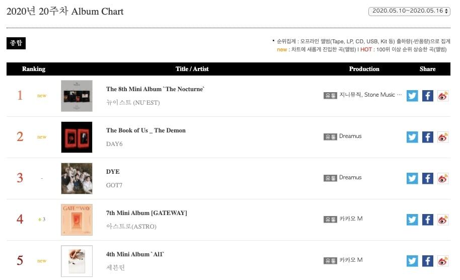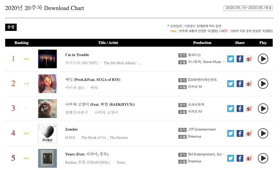 10 Mayıs – 16 Mayıs tarihleri arasında, NU’EST‘in sekizinci mini albümü “The Nocturne”, albüm listesinde 1 numara olurken; “I in Trouble” başlık şarkısı indirme listesi ve BGM listesinde (kullanıcıların blogları ve KakaoTalk profilleri için arka plan müziği olarak kullanmak üzere satın aldıkları şarkıları izleyen liste) birinci oldu. NU’EST, toplam üç listeyi ele geçirerek Üçlü Taç elde etti.