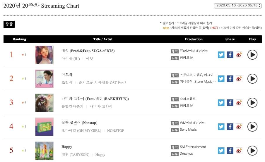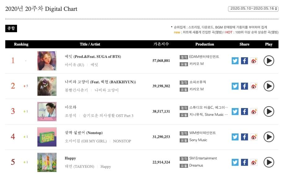 IUxSUGA iş birliği “Eight”, dijital şarkı ve stream listesinde 1 numaraya yerleşerek İkili Taç elde etti..