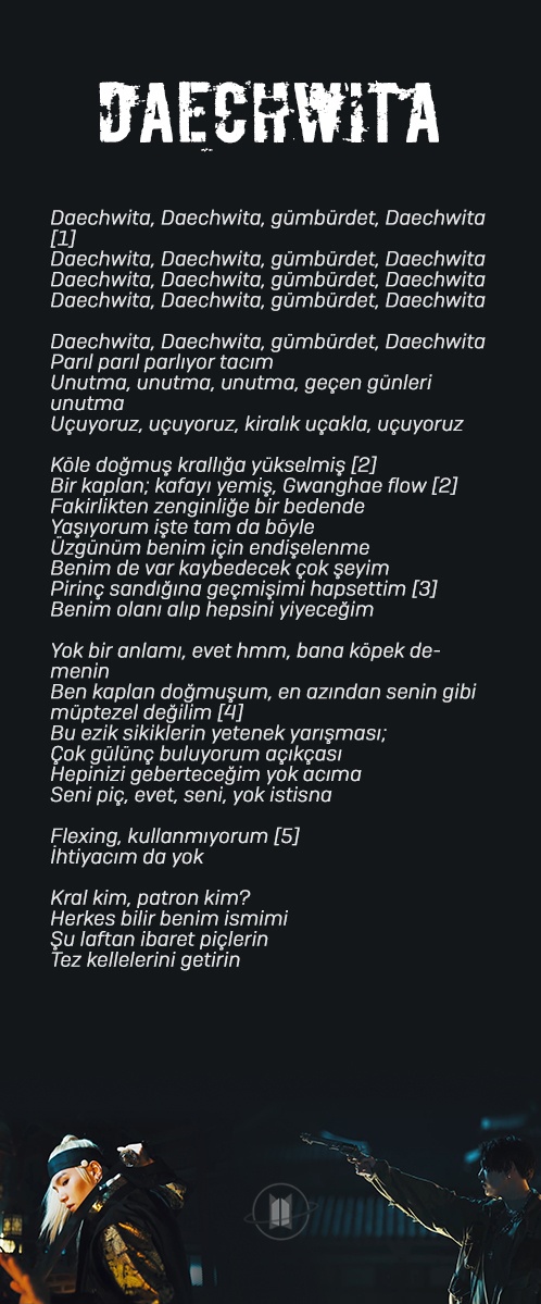 BTS‘ten SUGA, nam-ı diğer AGUST D, “D-2” isimli mixtape’ini yayımladı! Albümün başlık şarkısı “Daechwita” [대취타] “muhteşem üfleme ve vurma” anlamına geliyor. Genellikle yürüyüş sırasında, üflemeli ve vurmalı çalgılarla çalınan askeri müzikten oluşan geleneksel bir Kore müzik türü.