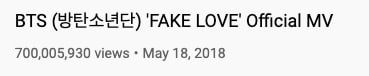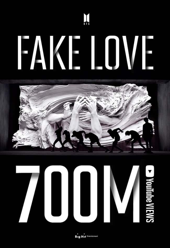 BTS’in müzik videolarından “FAKE LOVE”; bu izlenme sayısına ilk defa ulaşan Koreli erkek grubu müzik videosu “DNA”yi ve bu izlenmeye en hızlı ulaşan erkek grubu müzik videosu “Boy With Luv”ı takip ediyor. 700 milyon izlenme dönüm noktasına ulaşan diğer sanatçılar BLACKPINK ve PSY.