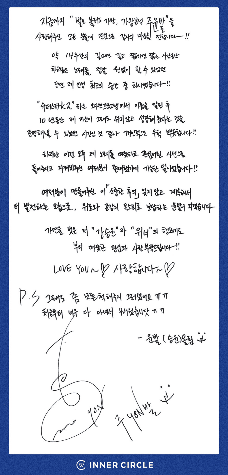 “Sevgilerini Chow Yun Fat’a gönderen herkese içten teşekkürlerimi sunuyorum! İnsanlara bir süreliğine sesimle biraz güç katmak beni çok mutlu etti! Tacın ağır olduğu ve yorgun olduğum zamanlar vardı, ancak izleyicilerin desteğinden güç kazanabildim. Çok teşekkür ederim! Perde arkasında güzel performanslar yaratmaya yardımcı olan ‘The King of Mask Singer’ın tüm prodüksiyon personeline, şarkılarımın parlamasına yardımcı olan band ve yedek şarkıcılara, nazik yorumlarını kesik etmeyen panelistlere, hepinize içtenlikle teşekkür ederim! Chow Yun Fat’ın veda etme zamanı geldi, ama WINNER’dan Kang Seung Yoon olarak daha da iyi döneceğim. Chow Yun Fat’ın kim olduğunu çok belli etmeyen ve sonuna kadar bilmiyormuş gibi davranan ICs’a teşekkür ederim.”