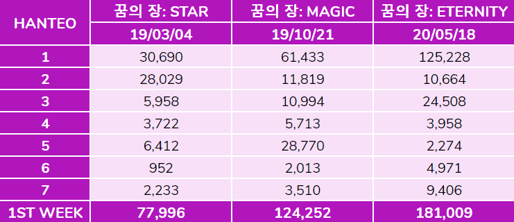 TXT, 18 Mayıs’ta yayımlanan 2. mini albümü “The Dream Chapter: ETERNITY” ile ilk haftasında Hanteo’da 181.009 kopya sattı. Ve böylece ilk haftasında en yüksek satışını yaptı.