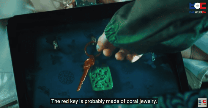 Bu anahtar, muhtemelen kırmızı mercandan yapılmış ve üzerinde yeşim bir süs var. Bu malzemelerin her ikisi de son derece değerli olduğundan; anahtar, eşit derecede değerli bir kişiye ait olmalı. Bu da, siyah saçlı Agust D‘nin kraliyet kanı taşıdığını düşündürtüyor.
