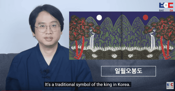 Güneş, ay, beş dağ, çam ağaçları ve şelaleler; Kore krallarının geleneksel sembolü olan Ilwol Obongdo’yu tasvir ediyor.
