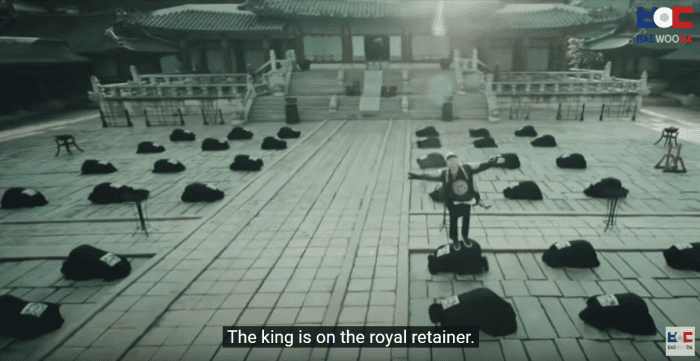 Jojeong’da, kralın çalışma alanının önündeki alanda toplananlar, kraliyet hizmetlileridir. Burası normalde, hizmetlilerin rütbeye göre oturduğu bir yerdir, ancak videoda yere doğru eğilmişler. Kralın, bir hizmetkâr üzerine çıkması, iyi bir kral değil de saygısız bir tiran olduğunun işaretidir.