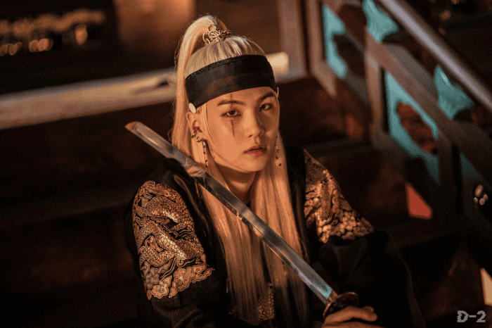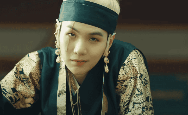 Sarışın Agust D, ejderha desenli kıyafetler giyiyor. Bu, Joseon döneminde kralların giydiği kıyafetlerin modern bir yorumu.