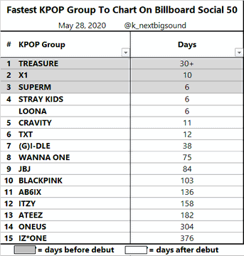 YG Entertainment’in Temmuz da çıkış yapması beklenen yeni erkek grubu Treasure geçtiğimiz günlerde bir rekora imza attı. Daha çıkış yapmasına 1 aydan fazla olan rookie grup, en kısa süre de Billboard Social 50 listesine grup oldu. 27 Mayıs 2020 tarihinde, Grubun ana vokallerinden olan Yedam’ın Solo projesi, dijital single parçasının yayımlanma tarihi belli olmuştu. Aynı gün Treasure maker, Treasure hayranları için 2. bir sevindirici gelişme oldu. Treasure Billboard Social 50 listesine 40. sıradan giriş yaptı. Bunu çıkışlarına daha 1 aydan fazla olmasına rağmen başaran grup, bu başarısıyla da bir rekora imza atmış oldu. BB50 listesine en hızlı , en kısa sürede giriş yapan Kpop grubu oldular. Treasure grubunu debutlarından 10 gün önce giriş yapmış olan X1 2. sırada, ve debutlarından 6 gün önce giriş yapmış olan SuperM 3. sırada takip ediyor. İlk 10 da yer alan diğer gruplar ise sırasıyla Stray Kids ve Loona debutlarından 6 gün sonra ile 4. sırada, Cravity 11 gün ile 5. , TXT 12 gün ile 6, (G)I_DLE 38 gün ile 7, Wanna One 75 gün ile 8, JBJ 84 gün ile 9 ve Blackpink 103 gün ile 10. sırada yer alıyor. Tam listeyi aşağıda görebilirsiniz.