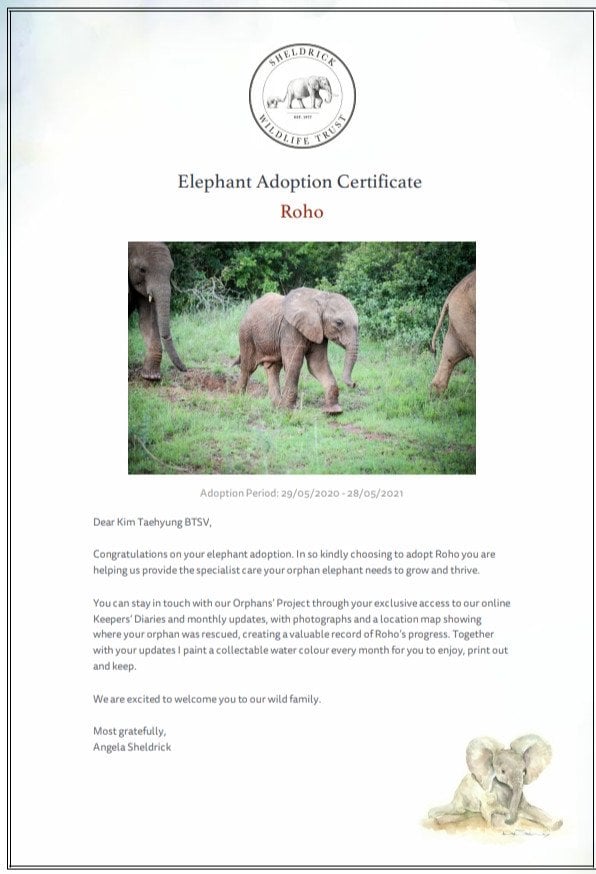 In celebration of Taehyung’s 7th anniversary, we adopted in his name, a baby elephant by the name Roho from @SheldrickTrust