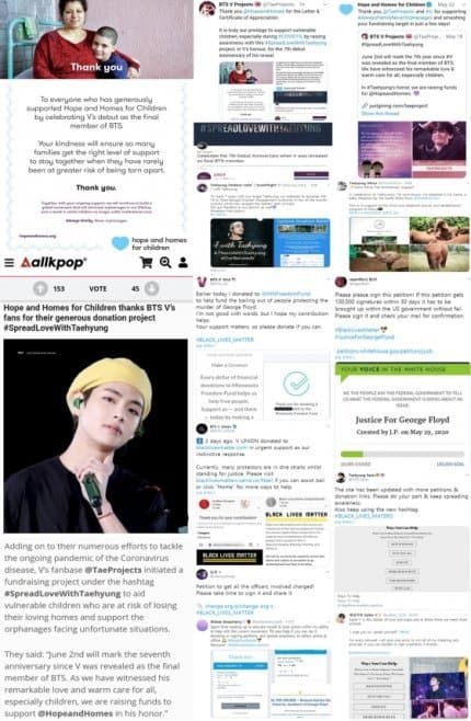 V‘nin hayran toplulukları, idolden ilham aldıkları büyük hayırseverlikleri ile tanınıyor. V‘nin yıl dönümünü, dünya çapında çeşitli projelere bağış yaparak kutladılar.