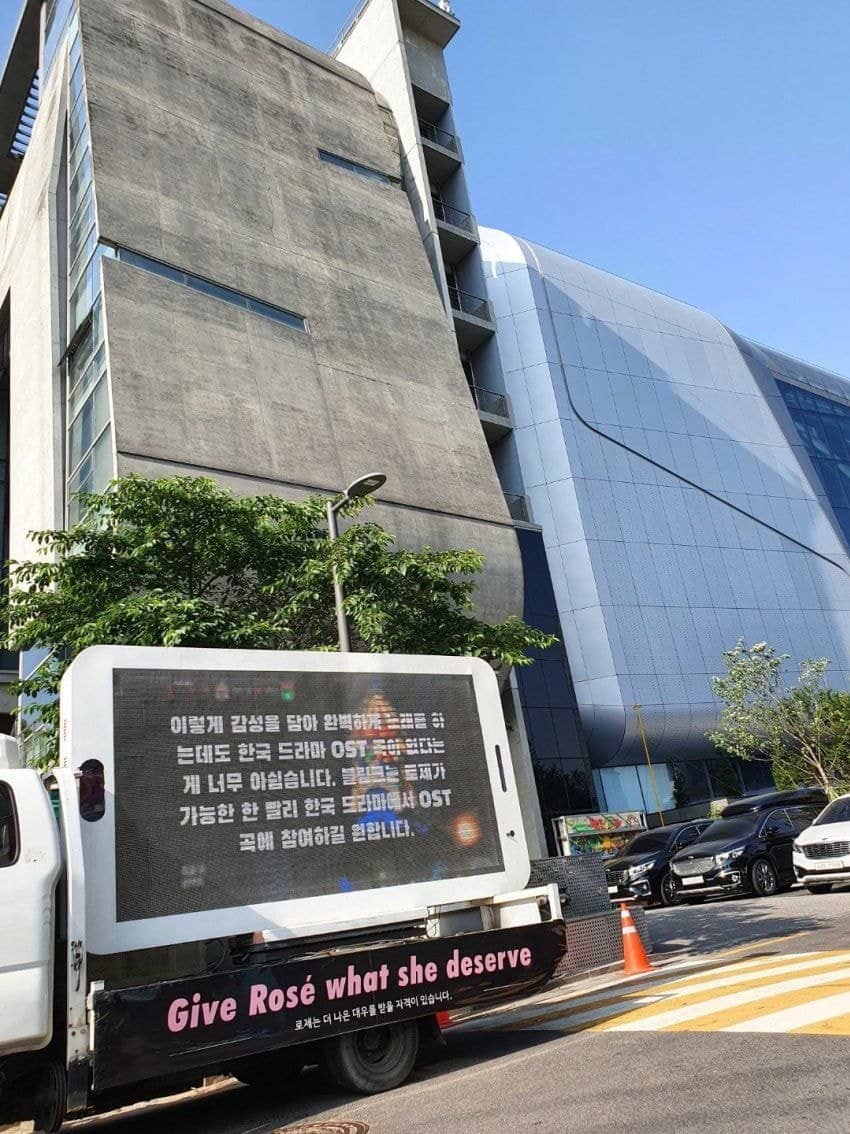 Haber: BLINKler tarafından ayarlanan kamyon, YG binasının önünde duruyor ve üzerinde BLACKPINK’ten Rosé’nin hak ettiği muameleyi alması gerektiğine ilişkin yazılar yazıyor.