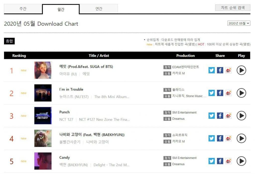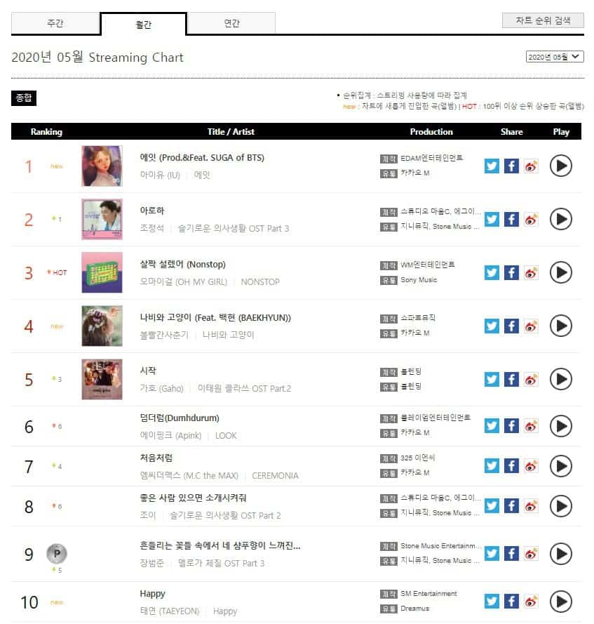 Dijital şarkı listesinin Ocak ayı birincisi Changmo “Meteor”, Şubat ayı birincisi Zico “Any Song”, Mart ayı birincisi Gaho “Start”, Nisan ayı birincisi Jo Jung Suk “Aloha” idi.