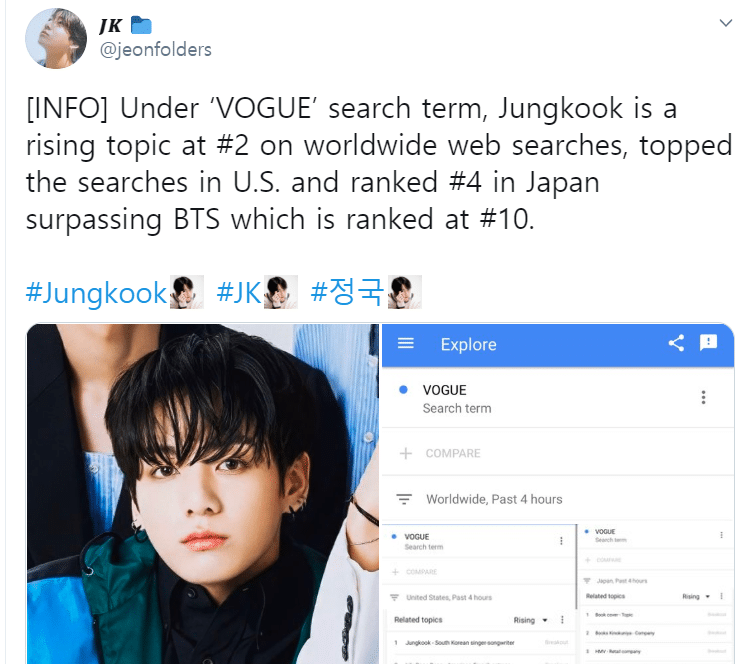 Jungkook bugün, Google’da VOGUE aramalarında: ABD’de #1, dünya çapında #2, Japonya’da #4 numarada sıcak gündem konusuydu.