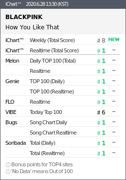 Ayrıca, “How You Like That” 2020’de MelOn’da 1 numarada en uzun-süreli kalan grup şarkısı olurken, bu yıl ilk 24 saatte MelOn’da 835.000 dinleyici sayısını geçen ilk ve tek idol grubu şarkısı oldu.