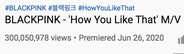 17 Temmuz’da Kore saatine göre yaklaşık akşam 6:11’de, “How You Like That” müzik videosu YouTube’da 300 milyon izlenmeyi geçti.Müzik videosu 26 Haziran’da Kore saatine göre akşam 6’da yayınlandı,bunun anlamı sadece 21 günde ve 11 dakikada başarıya ulaştı!