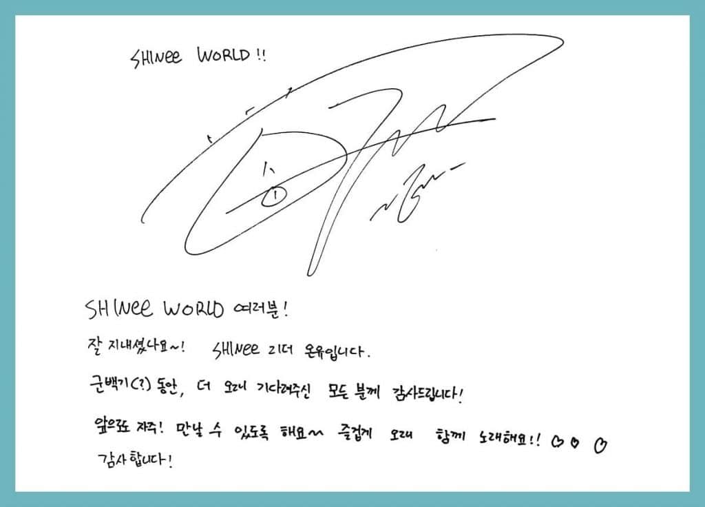 Onew hayranlarına el yazısıyla mektup yazdı.